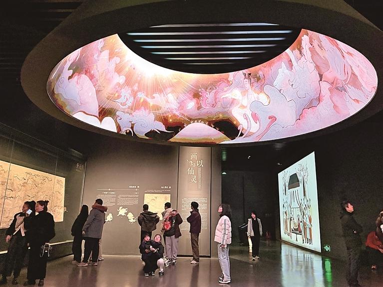 游客在太原北齐壁画博物馆穹隆顶360度环幕上,观赏壁画中的神仙形象。光明日报记者 张楠摄/光明图片